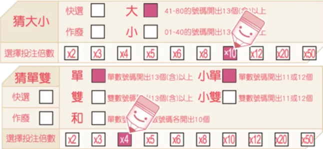 注意:「猜大小」、「猜單雙」兩款附加玩法之投注倍數需另外勾選,如未勾選,則皆以一倍計算之。下圖為「猜大小」玩法選擇10倍與「猜單雙」玩法選擇4倍的投注倍數。